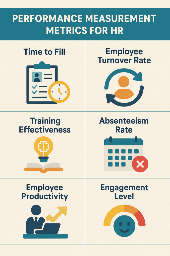Human Resource (HR) performance is often measured with HR-specific metrics. These metrics show how effectively people are being managed, developed, and retained. These metrics help align HR practices with organizational goals. The metrics include:
