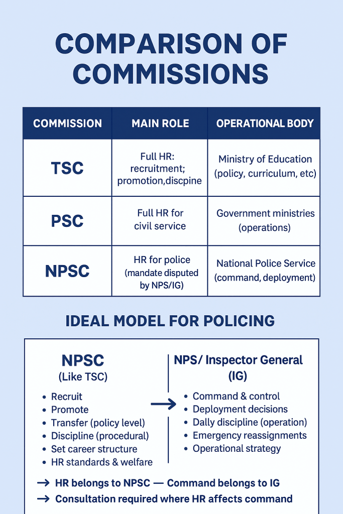 The relationship between the National Police Service Commission (NPSC) and the National Police Service (NPS) has recently been marked by conflict over roles in recruitment, promotion, discipline, and deployment. Here I will examines the dispute through a Human Resource Management (HRM) lens, compare the NPSC structure with other commissions like the Teachers Service Commission (TSC) and the Public Service Commission (PSC), and proposes an ideal governance framework that can harmonise HRM functions with policing operational needs.